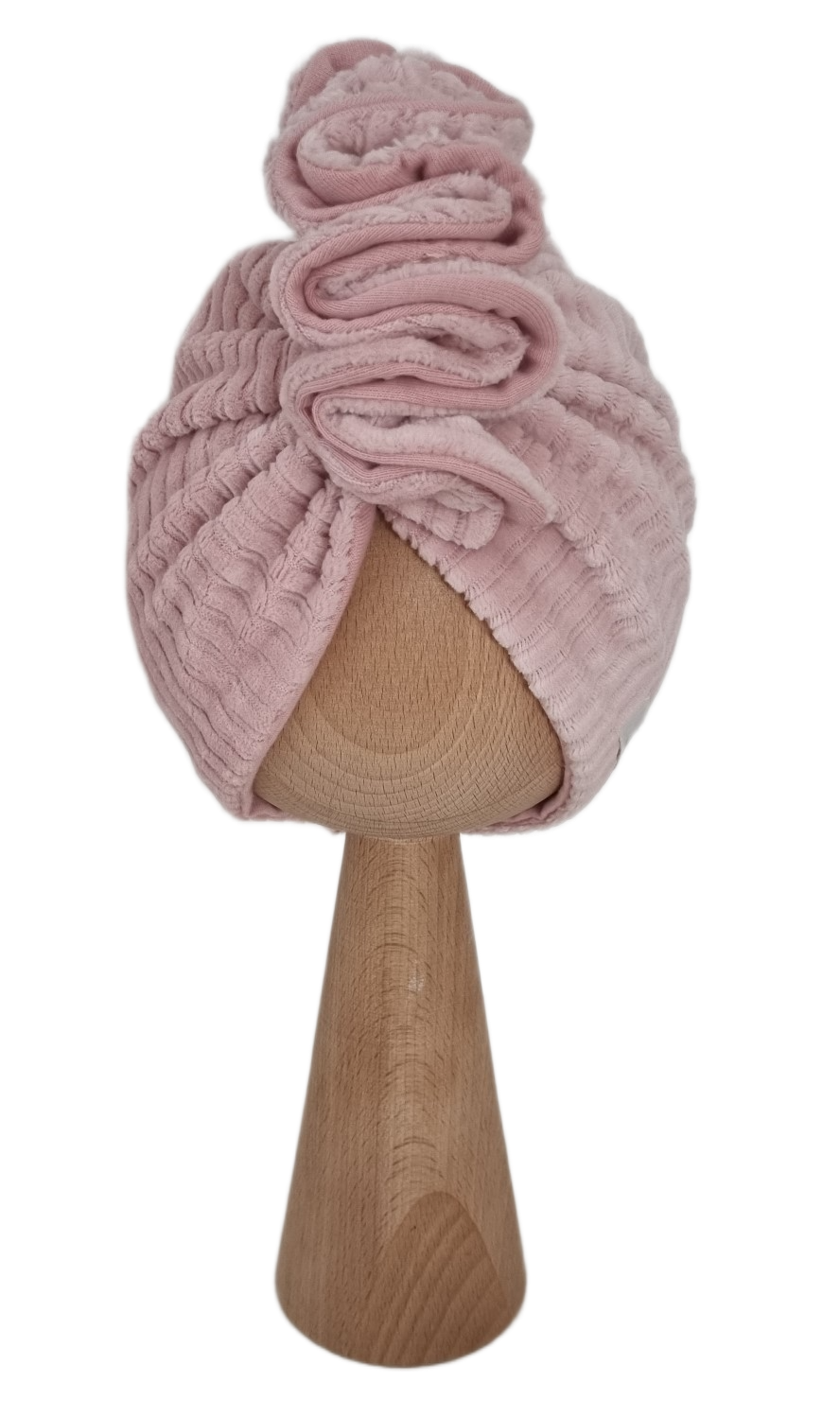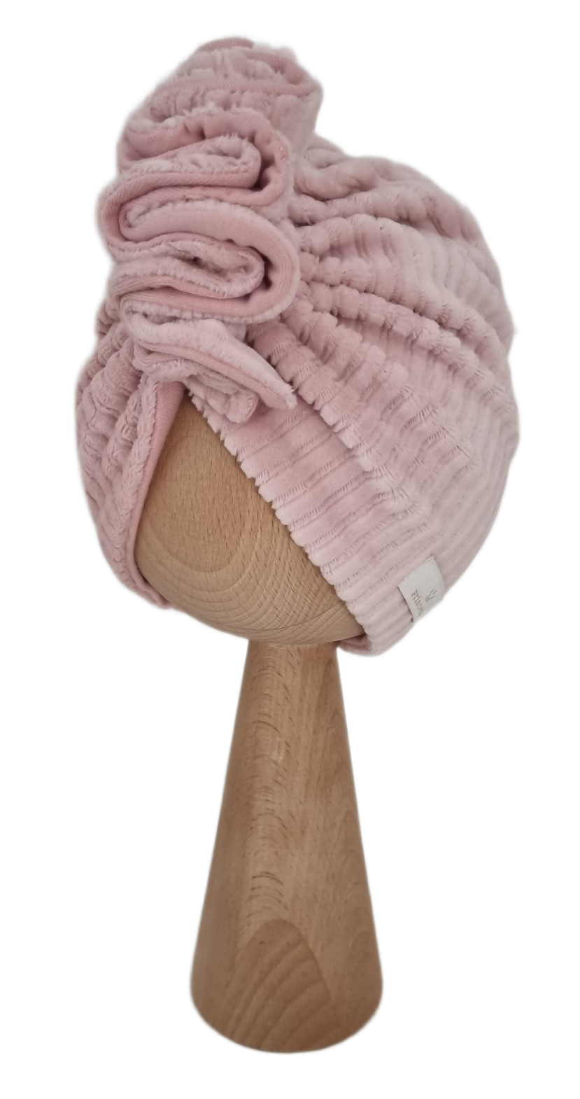 WELUROWY PODWÓJNY TURBAN Z OZDOBNĄ FALBANKĄ wygląda niezwykle efektownie, a przy tym jest bardzo praktyczny. Ze względu na swoją elastyczność pięknie dopasowuje się do głowy dziecka, przez co dziewczynki noszą go zdecydowanie chętniej niż czapki.