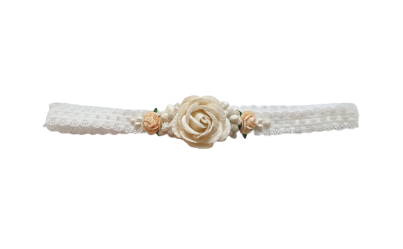 Wyjątkowa opaska wykonana w formie wianuszka, z różyczek w odcieniach beżu i delikatnego różu, połączonymi z białymi i różowymi koralikami.