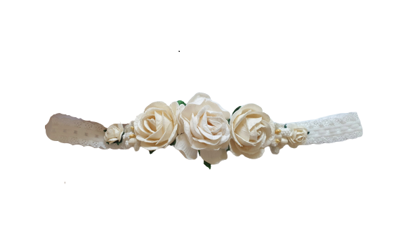 Wyjątkowa opaska wykonana w formie wianuszka, z różyczek w dwóch odcieniach beżu, połączonymi z białymi i złotymi koralikami.