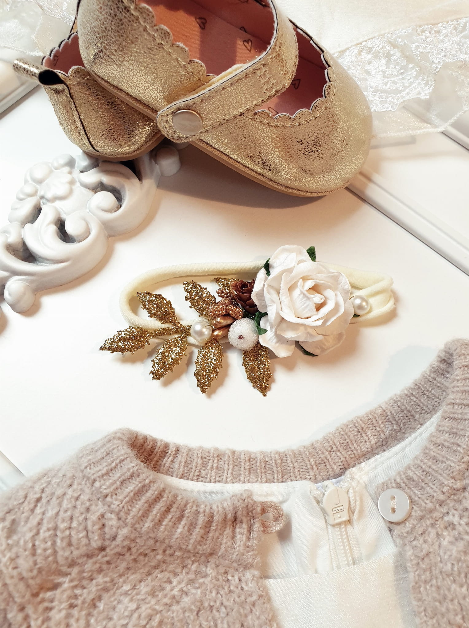 Wyjątkowa opaska w odcieniu bieli i złota, wykonana w formie wianuszka.
